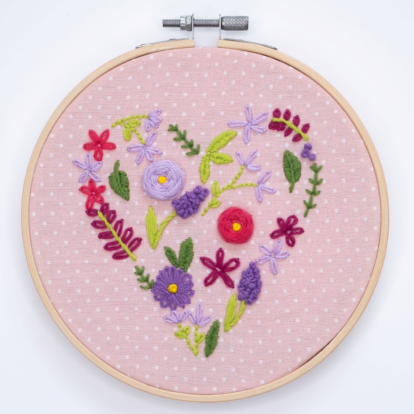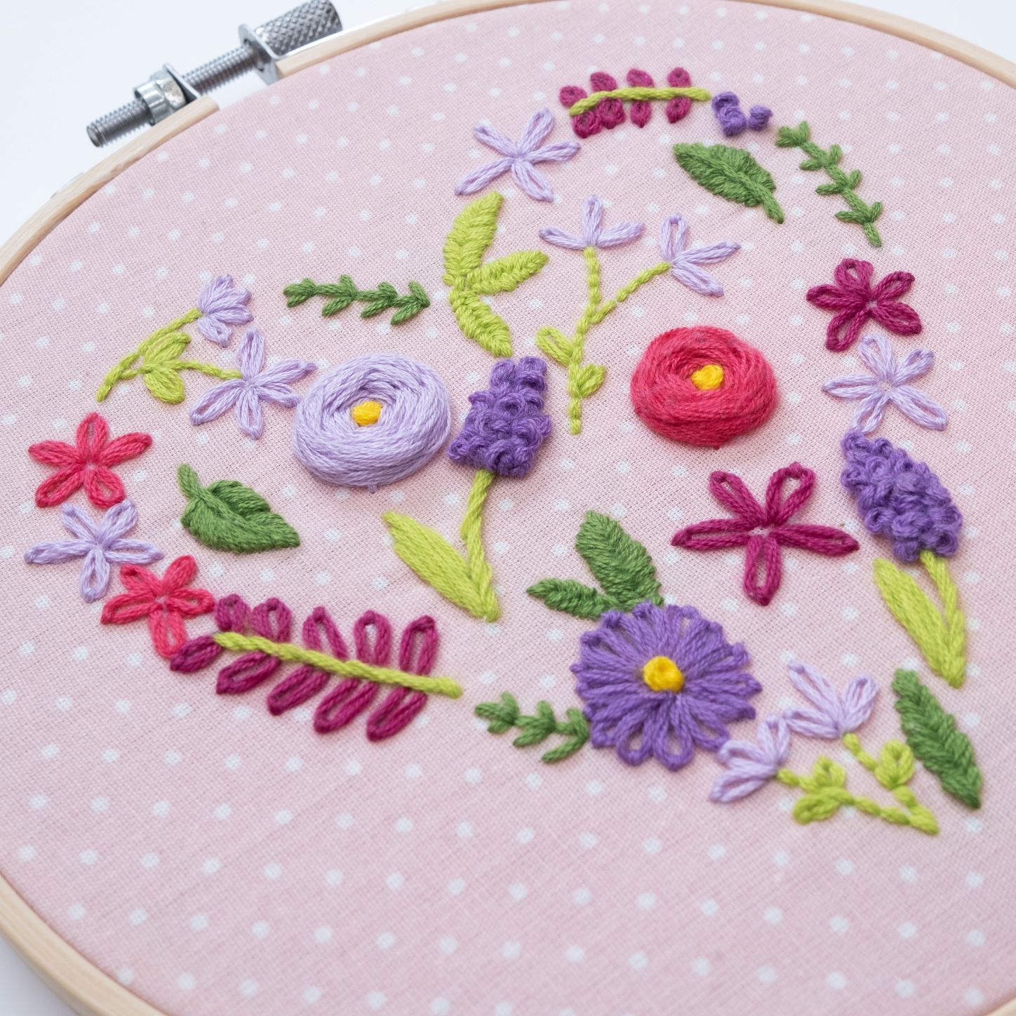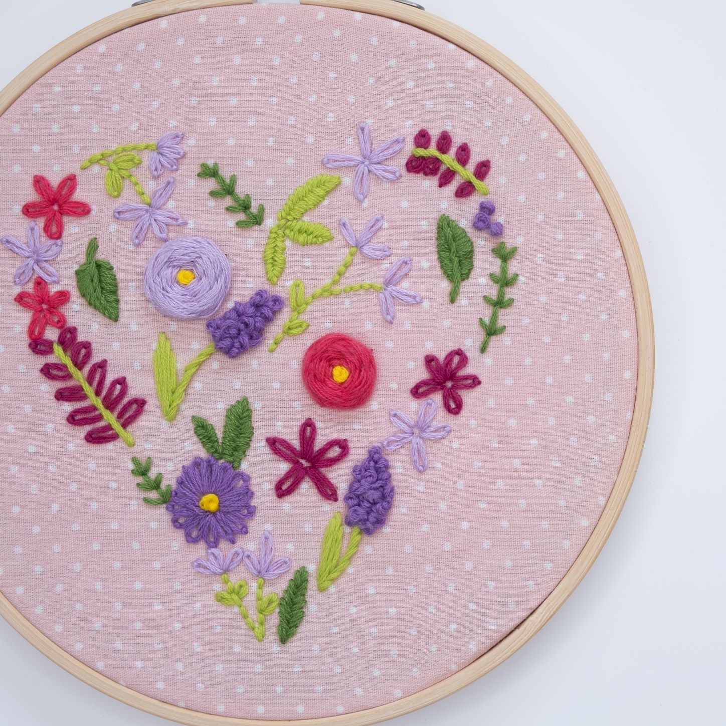Borduurwerk met bloemen in de vorm van een hart. Ik heb hierbij gebruik gemaakt van de techniek: vrij borduren. Zoals de naam zegt: “een hart vol bloemen”. De bloemen zijn geborduurd in verschillende tinten roze en paars en de blaadjes en stengels in twee kleuren groen.