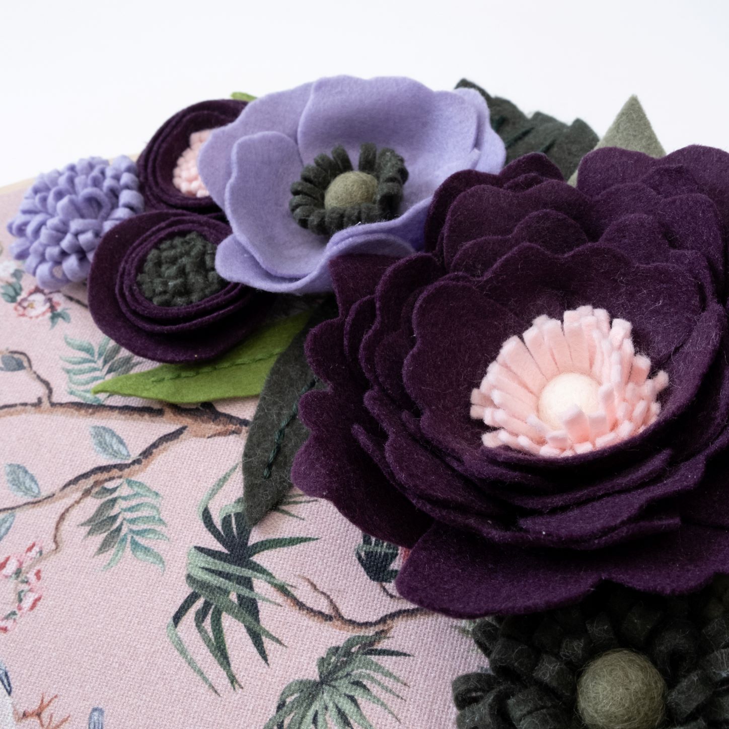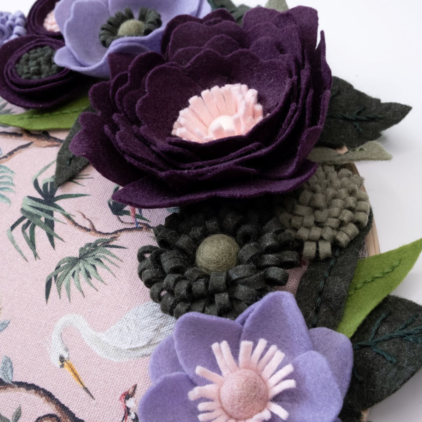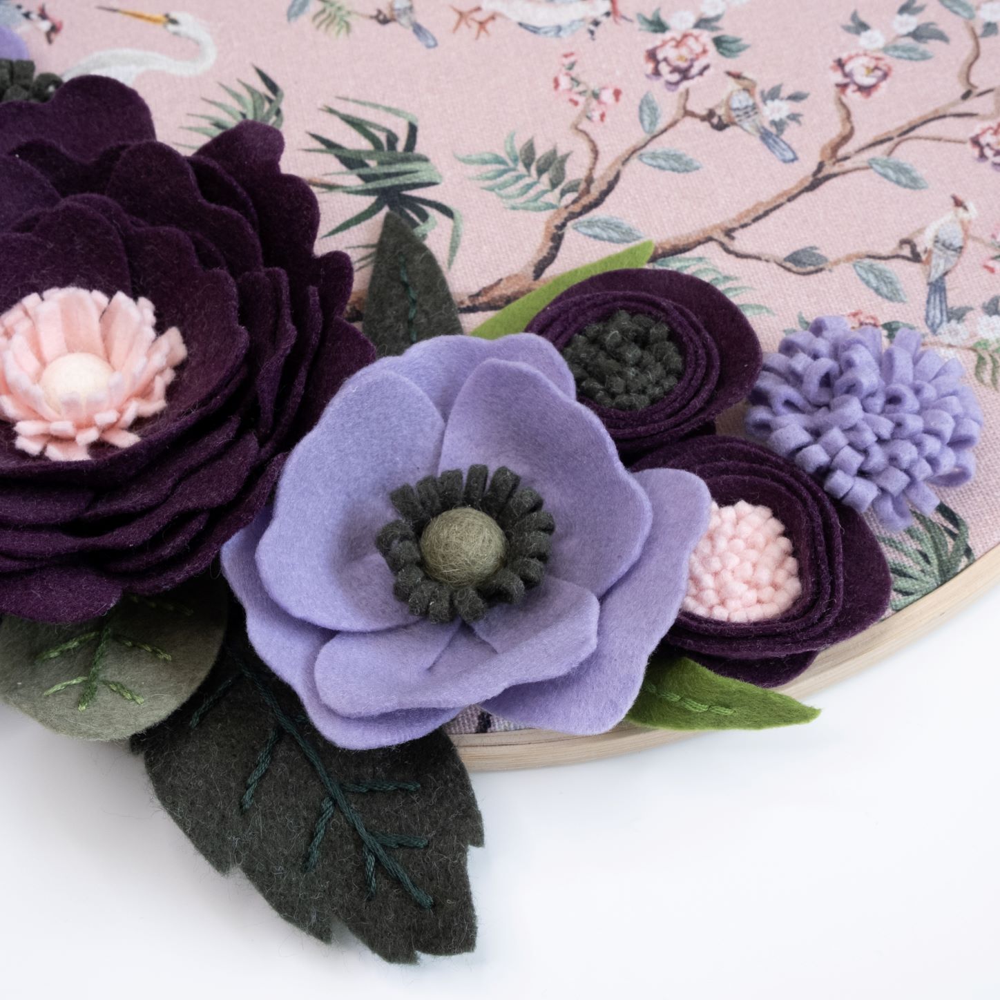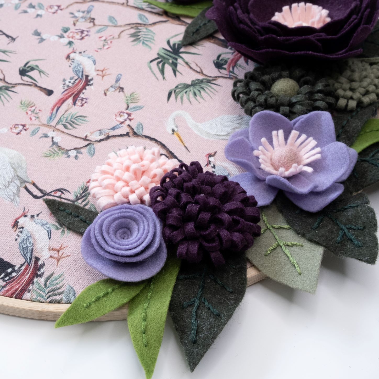 Viltbloemen in de verschillende tinten: lila, aubergine paars en lichtroze. De blaadjes zijn geborduurd en in 3 verschillende tinten groen. Alles is handgemaakt en zelf ontworpen. De bloemen en bladeren zijn bevestigd op een licht roze stof met vogels en bomen. De diameter van de borduurring is 36 cm.